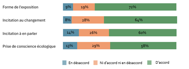 Secondly, a majority of respondents (72%) felt that certain elements of the exhibition provided them with an environment conducive to receiving information, as well as convincing them that the arts can help them understand complex scientific information. Sixty-four percent consider that, as a result of the exhibition, they are ready to change their habits to consume more products bought in bulk, and thus increase their zero-waste behavior. Sixty percent were encouraged to talk about the exhibition with friends and family. Last but not least, 58% of respondents were aware of the exhibition. Certain elements of the exhibition had raised their awareness of zero waste and, more broadly, of ecology. Thanks to the exhibition, a majority became more aware of their consumption habits and the impact of over-consumption of single-use packaging on the environment.